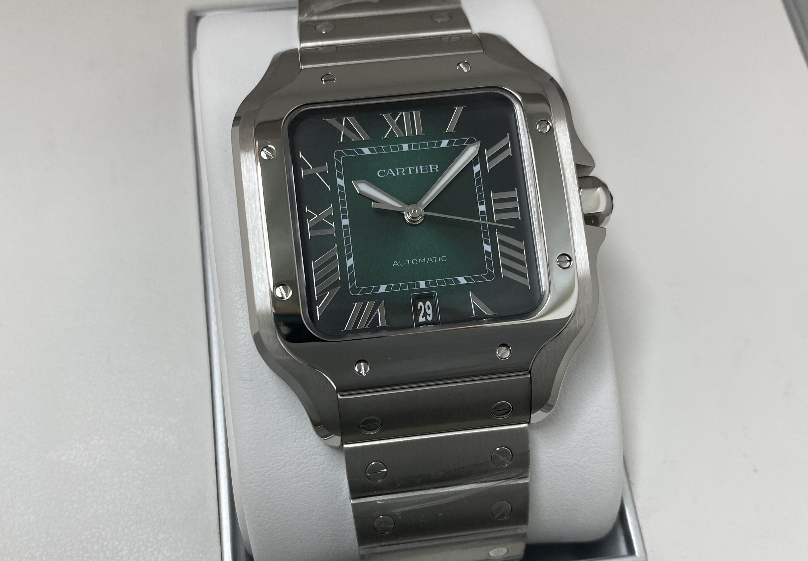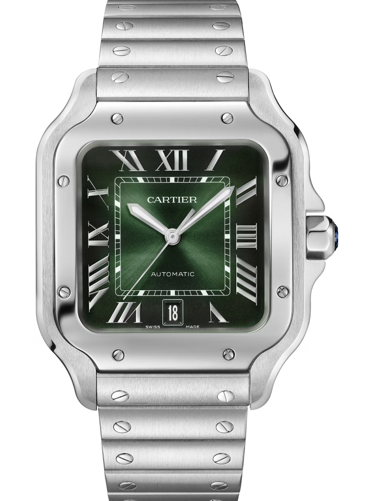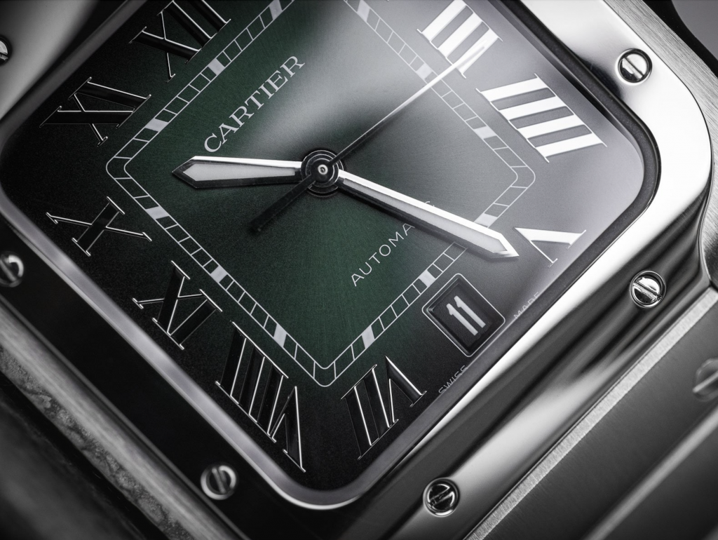 Темный зеленый оттенок циферблата получается путем ручного нанесения тонированного слоя лака на циферблат. Вдобавок ко всему, цвета имеют приятный градиент. Они начинаются светлее в середине циферблата и углубляются к краям, поэтому очевидно, что более темный вид — это то, чего добивались дизайнеры Cartier.