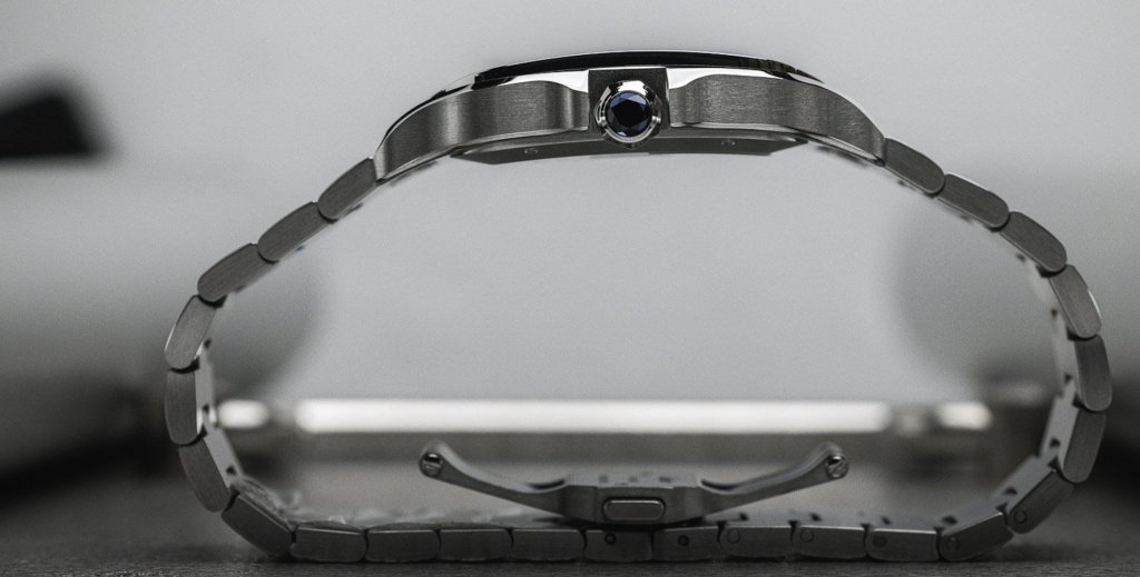 Cartier Santos WSSA0062 имеет знакомую и элегантно изогнутую, эргономичную форму, которая приятно облегает запястье. Линии ушек отражают более округлые ощущения, поскольку они перетекают в браслет и вверх в защитные накладки заводной головки. Это часы, лишенные острых краев, это по сути квадратные часы, которые гордятся своей круглой формой.