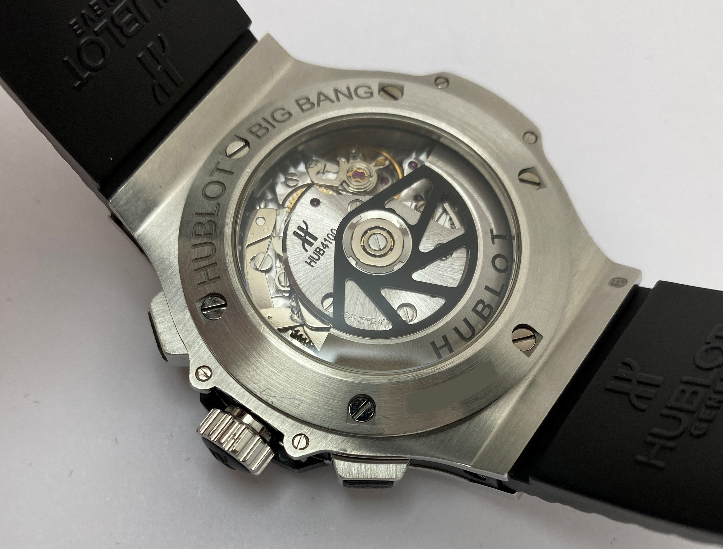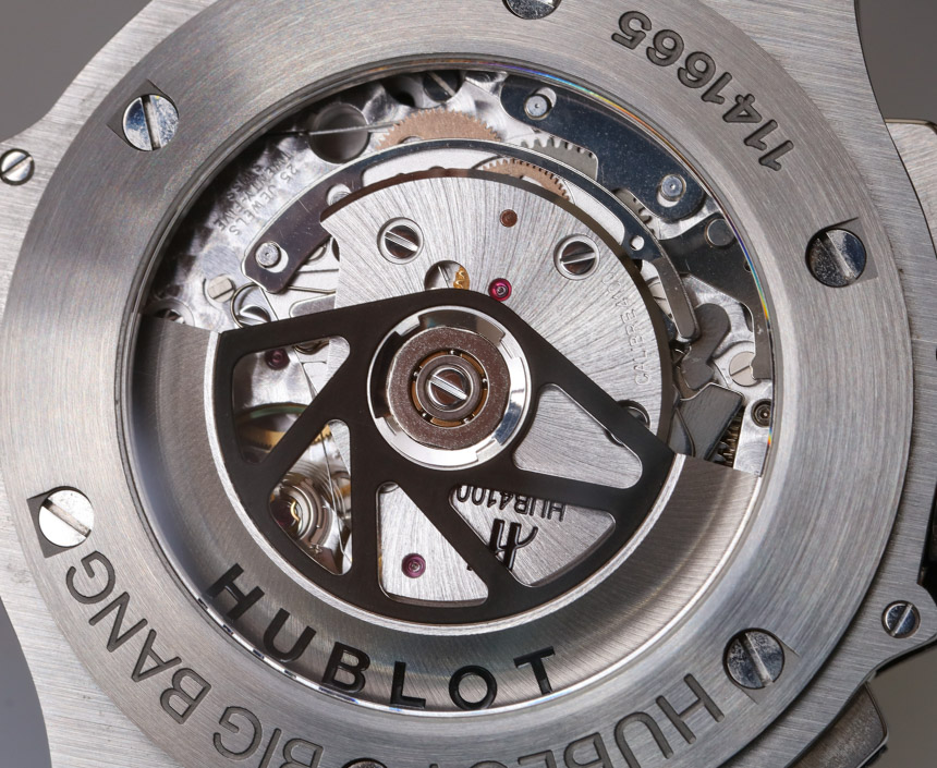 - Швейцарский механизм ETA внутри Big Bang 44 — это калибр HUB4100. С большим количеством декоративных настроек можно увидеть механизм через заднюю крышку часов. Автоматический механизм работает на частоте 4 Гц (28 800 пк/ч) с запасом хода около 44 часов.
